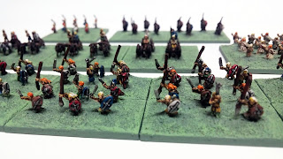 In last night's Frostgrave game... my Orc witch and his swarthy crew entered the frozen city and went up against Lizzy's wizard and her bunch of dwarven reprobates in a skirmish over a magical fountain in "The Well of Dreams and Sorrows" scenario from the main rulebook.. We were using the Ulterior motives cards: Lizzy had "Last Meal" in which she was trying to hunt down a zombie who had eaten a magic ring... and I had "Once Bitten" - one of my thugs had been bitten by a werewolf, and if it wasn't killed by the end of round 4, he would also become one...